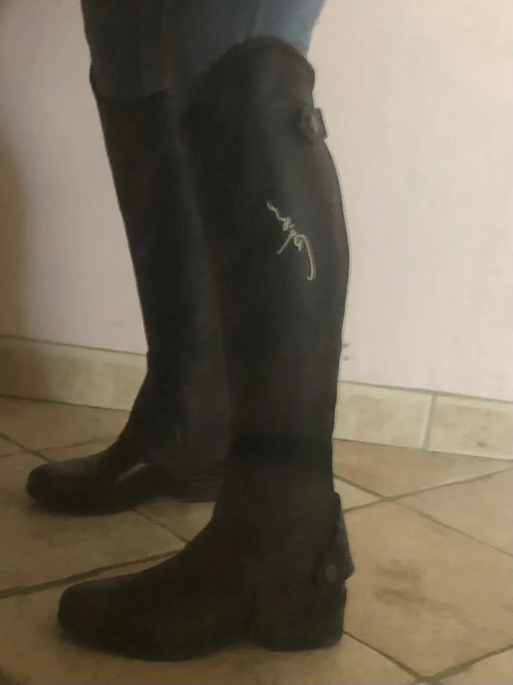 • Le haut de la chaps est en forme de goutte d'eau en cuir grainé noir, où est brodé le logo Dyon couleur crème